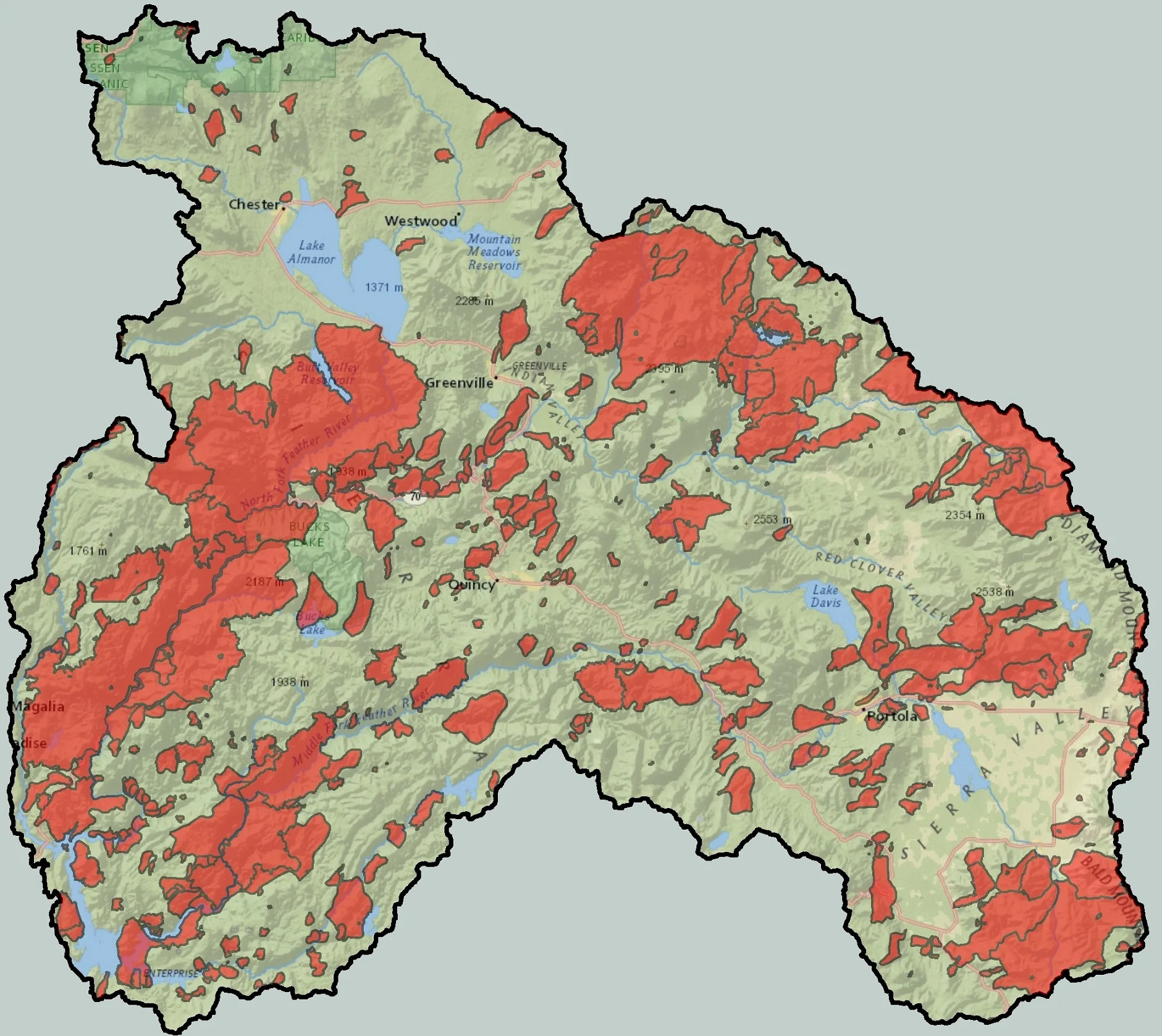 For example, let’s say we are interested in potentially using sediment as a condition indicator. We know that an excess of fine sediment is harmful to fish, with high amounts able to smother viable spawning gravels and even kill live fish like the juveniles produced by the Lake Almanor rainbow trout shown below (note that these fish were not actually harmed by any human activities). There are established methods of measuring both the natural dynamics of and anthropogenic influence on the sediment regime*, such natural soil erosion rates or road densities (which contribute to erosion). We also have very good data sources; soil characteristics have been mapped since the late 19th and early 20th century in United States Department of Agriculture initiatives related to food security and national productivity, including in our national forests! So, we therefore also know that we have Basin-wide coverage for data sources related to sediment. Additionally, there are many studies that have meaningfully documented the impacts of excessive sediment on water quality, and thus fisheries.